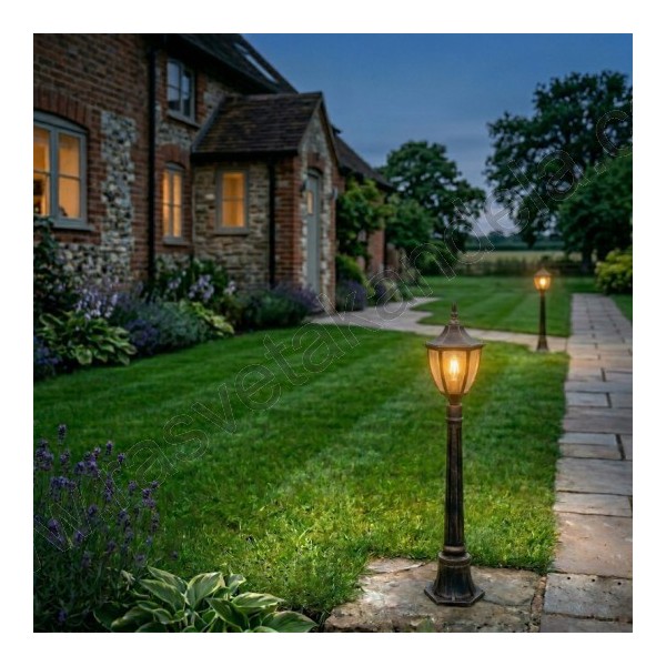 Fenjer stubni M2004-SV braon. Brend: Mitea lighting. Materijal: Legura aluminijuma (nerđajući) + staklo. Boja tela: Braon sa nežnom zlatnom nijansom. Broj staklenih delova: 6 + 6. Dimenzija: 225 mm x 1110 mm. Grlo porcelansko: 1 x E27. Snaga: 1 x max. 60W. Radni napon: 230V. Osnovna odlika: Visok kvalitet izrade i masivnost. IP zaštita: IP44 (vodootporan). Težina: 2,2 kg.