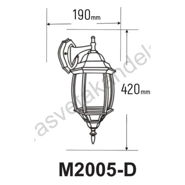 Fenjer zidni M2005-D crni. Brend: Mitea lighting. Materijal: Legura aluminijuma (nerđajući) + staklo. Boja tela: Crna. Boja stakla: Transparentna. Dimenzije: 190 mm x 420 mm. Grlo porcelansko: 1 x E27. Snaga: 1 x max. 60W. Radni napon: 230V. IP zaštita: IP44. Težina: 1,2 kg.