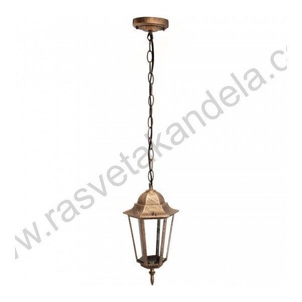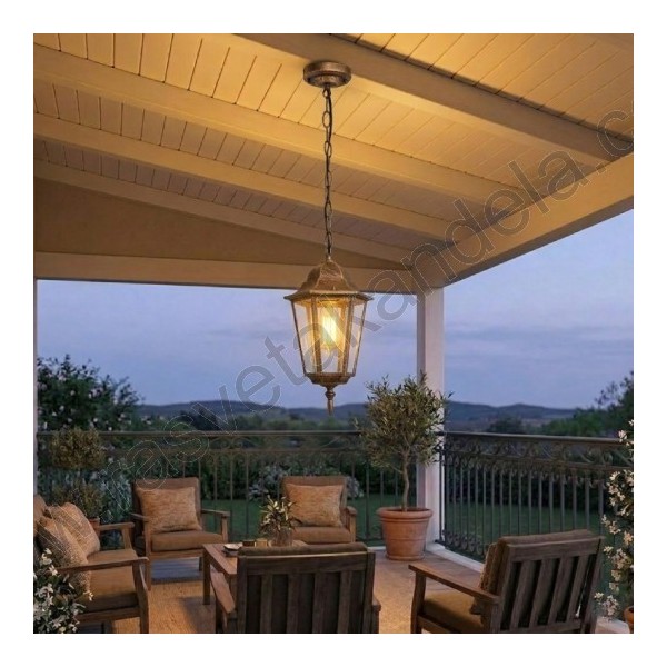 Fenjer viseći M2002-V braon. Brend: Mitea lighting. Materijal: Legura aluminijuma (nerđajući) + staklo. Boja tela: Braon. Staklo je prozirno. Broj staklenih delova: 6. Visina fenjera sa lancem: 770 mm. Dimenzije abažura: 170 mm x 170 mm. Prečnik dela, koji se tipluje na plafon: 105 mm. Grlo porcelansko: 1 x E27. Snaga: 1 x max. 60W. Radni napon: 220-240V. IP zaštita: IP44 (vodootporan). Način montaže: Na plafon. Stepen električne zaštite: I klasa. Sijalica uključena uz proizvod: NE. Težina: 950g.