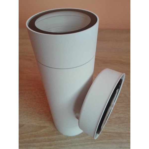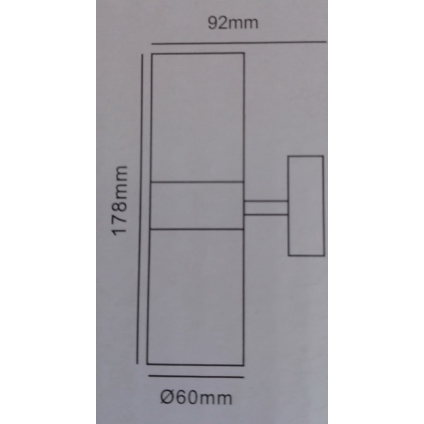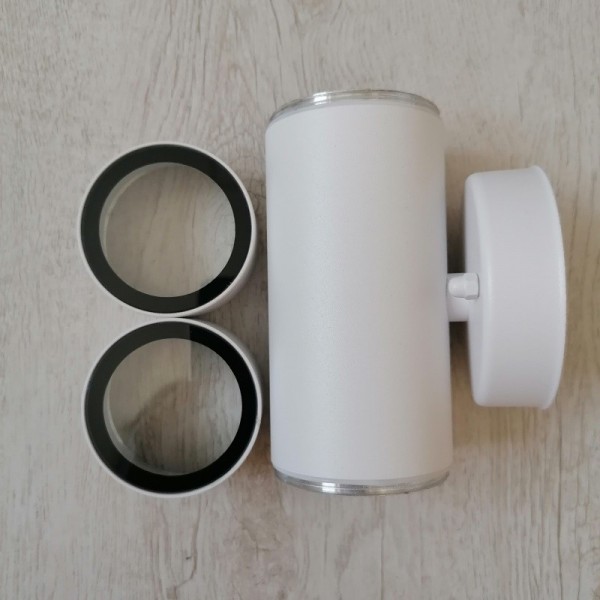 Baštenska zidna lampa M950012 - spoljna svetiljka. Brend: Mitea lighting. Matetrijal: Aluminijum + staklo. Dimenzije: dužina 178mm x širina 90 mm. Prečnik senila: cev fi 60mm. Prečnik dela za tiplovanje na zid: 77mm. Boja: Mat bela. IP zaštita: IP54 (vodootporna). Izvor svetla: 2 x GU10 max.35W. Radni napon: 220~240V. Tip grla: GU10. Težina lampe: 430g. Pravilna montaža: Na zid (fasadna rasveta). Sijalice uključene uz proizvod: NE. Lampa je kvalitetna i masivna.