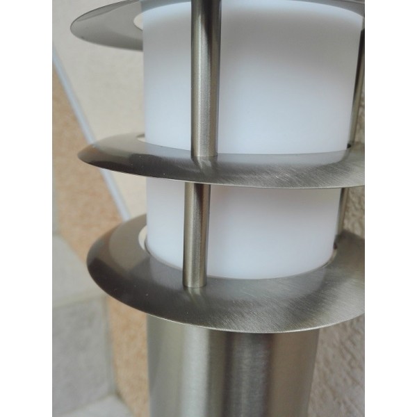 Baštenska zidna lampa HL201 LADIN-2 - zidna spoljna svetiljka. Brend: Horoz. Materijal: Pocinkovani nerđajući čelik + PC (polikarbonat). Materijal tela lampe: Pocinkovani nerđajući čelik. Materijal difuzora: PC - otporan na visoke temperature. Visina lampe: 350 mm. Dimenzije difuzora: prečnik 120 mm x 180 mm. Boja difuzora: Bela. Prečnik dela, koji se tipluje na zid: 110 mm. Od zida: 165 mm. Grlo: 1 x E27. Snaga: Max 60W. Napon: 220-240V. Boja osnove lampe: Mat hrom. Način montaže: Na zid spolja. IP zaštita: IP44 (vodootporna).