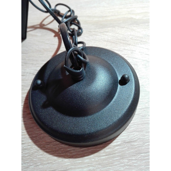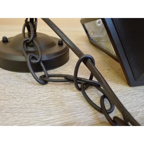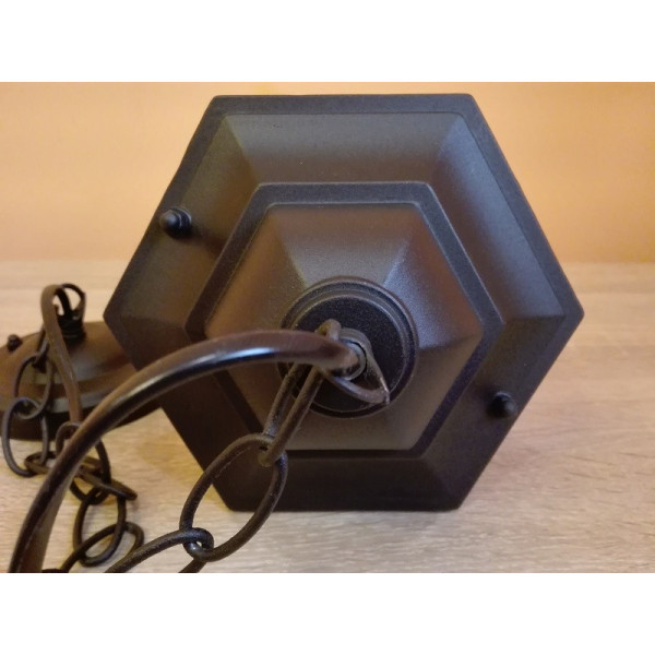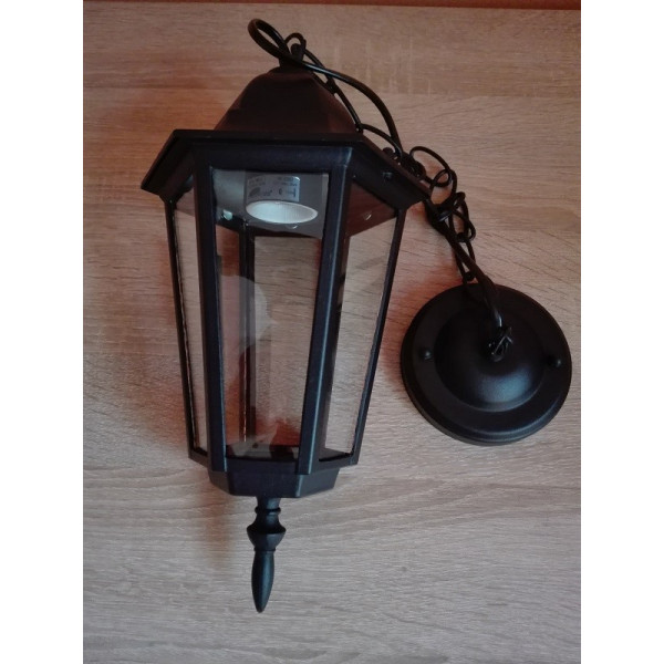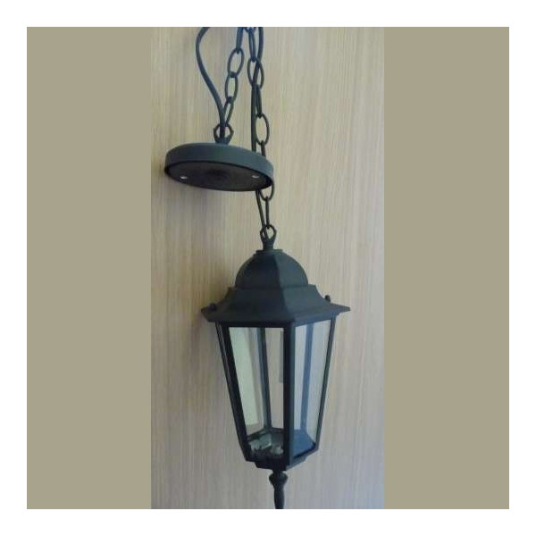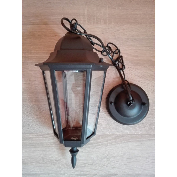 Fenjer viseći M2002-V crni. Materijal:Legura aluminijuma (nerđajući)/staklo. Broj staklenih delova: 6. Visina: 77 cm. Prečnik: 17 cm. Prečnik dela, koji se montira na plafon: 10,5 cm. Grlo porcelansko: 1 x E27. Izvor svetlosti: 1 x 60W. Radni napon: 230V. IP zaštita: IP44. Sijalica uključena: NE. Težina fenjera: 900 g.