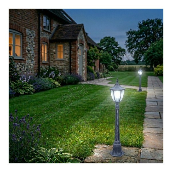 Fenjer stubni M2002-SV crni. Materijal: Legura aluminijuma (nerđajući) + staklo. Boja tela fenjera: Crna. Boja stakla: Transparentna. Visina: 111,5 cm. Prečnik: 20,5 cm. Prečnik dela za montažu: 11,5 cm. Grlo: 1 x E27. Snaga: 1 x max. 60W. Radni napon: 230V. IP zaštita: IP44 (za spoljašnju upotrebu). Sijalice uključene: NE. Težina: 1,6 kg.