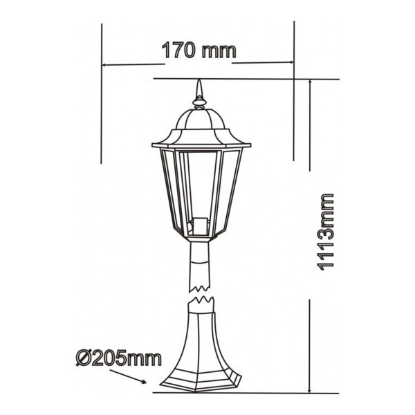 Fenjer stubni M2004-SV braon. Brend: Mitea lighting. Materijal: Legura aluminijuma (nerđajući) + staklo. Boja tela: Braon sa nežnom zlatnom nijansom. Broj staklenih delova: 6 + 6. Dimenzija: 225 mm x 1110 mm. Grlo porcelansko: 1 x E27. Snaga: 1 x max. 60W. Radni napon: 230V. Osnovna odlika: Visok kvalitet izrade i masivnost. IP zaštita: IP44 (vodootporan). Težina: 2,2 kg.