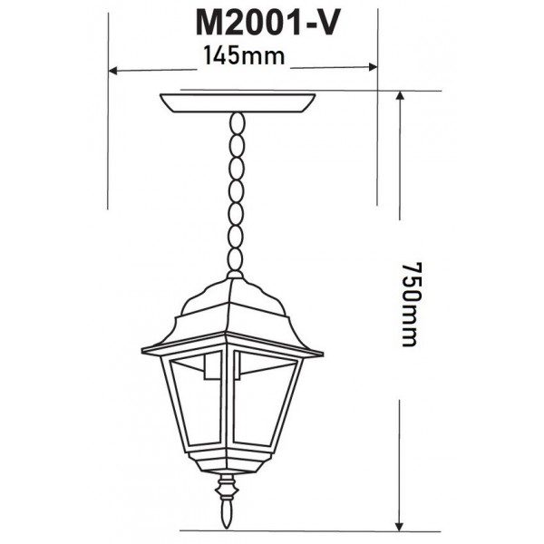 Fenjer viseći M2001-V crni. Brend: Mitea lighting. Boja: Crna. Materijal: legura aluminijuma (nerđajući)/staklo. Dimenzije: visina 750 mm, prečnik 145 mm. IP zaštita: IP44 Izvor svetla: max.60W Radni napon: 220~240V Stepen električne zaštite: I klasa Tip grla: E27 Pravilna montaža: Na plafon