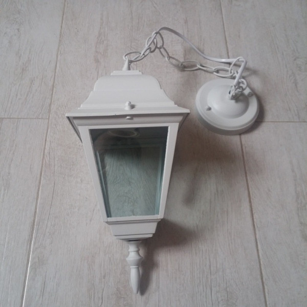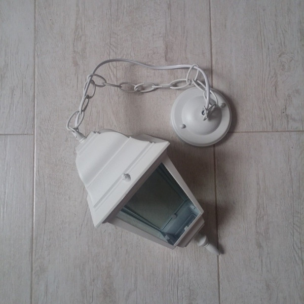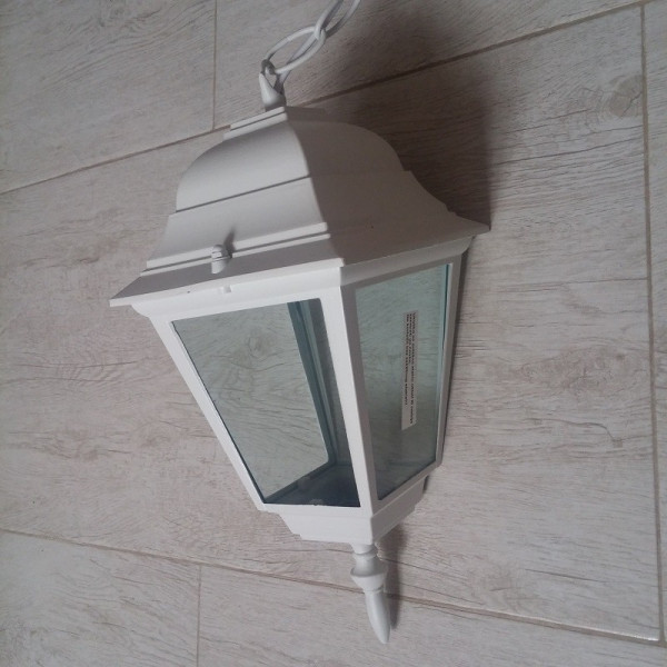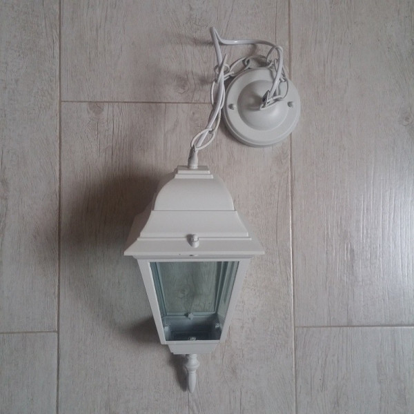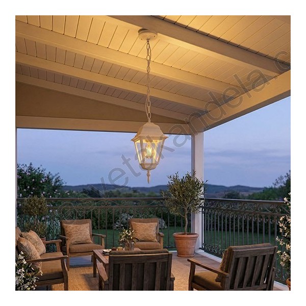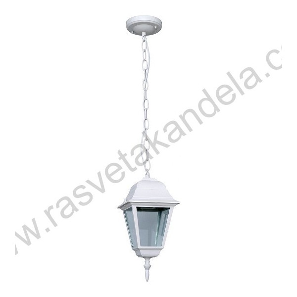 Fenjer viseći M2001-V beli. Bred: Mitea lighting. Materijal: Legura aluminijuma (nerđajući) + staklo. Boja tela: Bela. Staklo je prozirno. Broj staklenih delova: 4. Visina fenjera sa lancem: 750 mm. Dimenzija abažura: 145 mm x 145 mm. Grlo porcelansko: 1 x E27. Snaga: 1 x max. 60W. Radni napon: 220-240V. IP zaštita: IP44 (vodootporan). Grlo je smešteno u gornjem delu fenjera. Način montaže: Na plafon. Stepen električne zaštite: I klasa. Sijalica uključena uz proizvod: NE. Težina: 1 kg.
