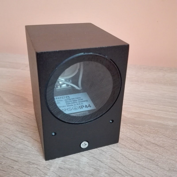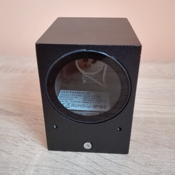 Baštenska zidna lampa WL7434 - zidna spoljna svetiljka. Brend: Optonica. Materijal: Aluminijum + staklo. Materijal tela: Aluminijum. Materijal difuzora: Staklo. Staklo je transparentno. Izvor svetla: 1 x GU10/max.35W. Napon: 220~240V / 50~60Hz. Dimenzije: 92 mm x 68 mm x 8 0mm. Boja osnove: Mat crna. IP zaštita: IP54 (vodootporna). Izvor svetlosti sa jedne strane lampe. Način montaže: Na zid (fasadna rasveta). Sijalice uključene u cenu: NE. Težina lampe: 350 g.