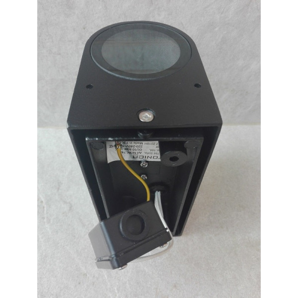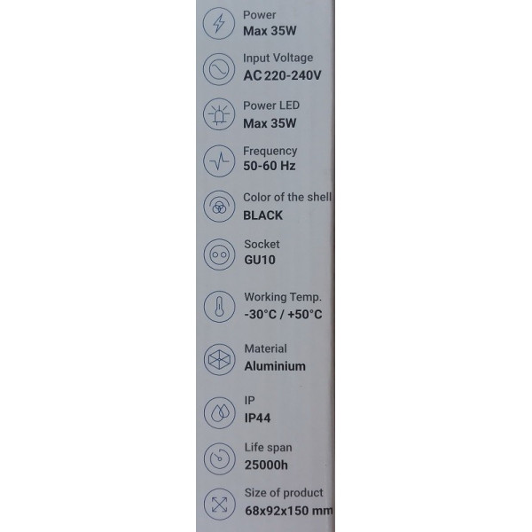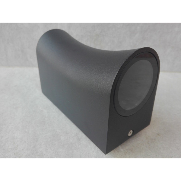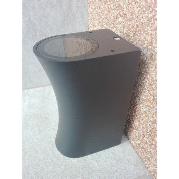 Baštenska zidna lampa WL7446 crna - zidna spoljna svetiljka. Brend: Optonica. Materijal: Aluminijum + staklo. Telo lampe blago izvijeno. Izvor svetla: 2 x GU10/max35W. Napon: 220~240V / 50~60Hz. Dimenzije: 92mm x 68mm x 150mm. Boja osnove: crna. IP zaštita: IP44. Sijalice uključene: NE. Izvor svetlosti sa obe strane lampe. Lampa je masivna. Težina lampe: 500 g.