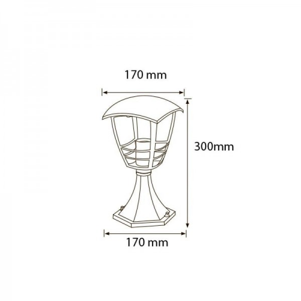 Fenjer stubni NAR-3 crni. Brend: Horoz. Materijal: Aluminijum + plastic. Materijal tela: Aluminijum. Materijal senila: Plastic. Difuzer je transparentan. Boja: Crna. Visina fenjera: 300 mm. Dimenzije senila: širina 170 mm x visina 170 mm. Širina postolja: 170 mm. Grlo: 1 x E27. Snaga: 1 x 60W max. Radni napon: 220-240V/50-60Hz. IP zaštita: IP44 (vodootporan). Sijalice uključene: NE.