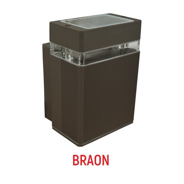 Baštenska zidna lampa M036 B braon - zidna spoljna svetiljka. Brend: MITEA Lighting Dimenzije: L110mm x W100mm x H160mm Materijal: Aluminijum + Staklo. Materijal senila: Transparentno staklo. Izvor svetla: 1xGU10/max.35W. Napon: 220~240V / 50~60Hz. Boja osnove: Braon. IP zaštita: IP44 (vodootporna). I klasa el.zaštite. Lampa je kvalitetna, masivna. Sijalice uključene u cenu: NE. Način montaže: Na zid (fasadna rasveta).