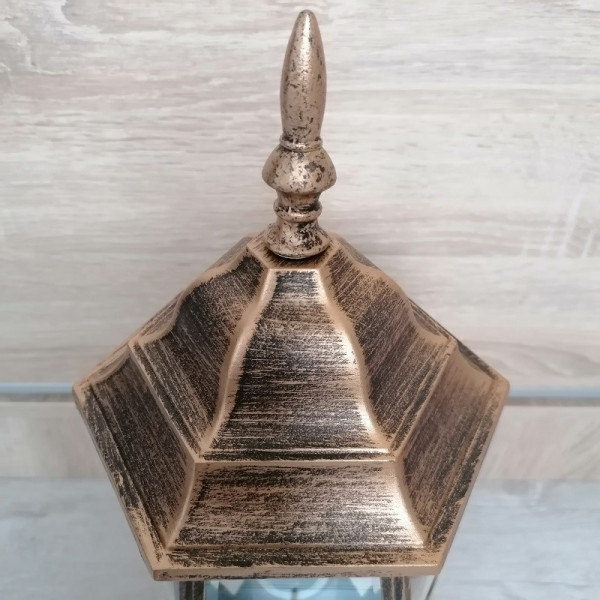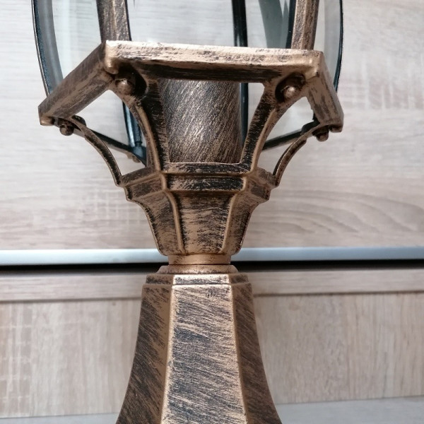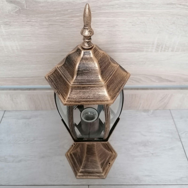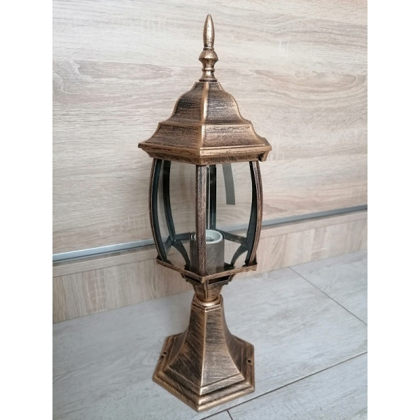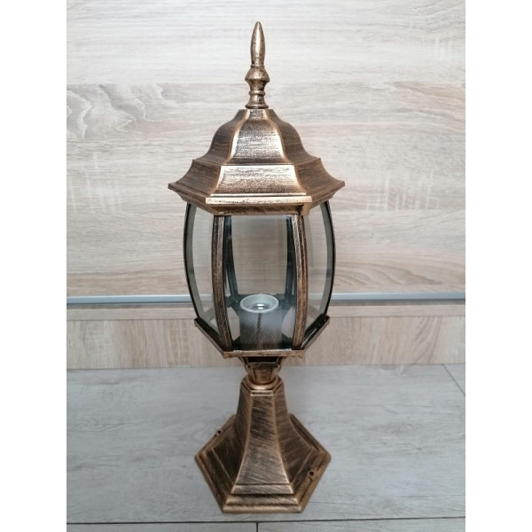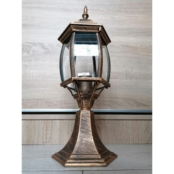 Fenjer stubni M2005-S braon. Brend: Mitea lighting. Materijal: Legura aluminijuma (nerđajući) + staklo. Boja tela: Braon. Boja stakla: Transparentna. Broj staklenih delova: 6. Visina fenjera: 455 mm. Širina fenjera: 165 mm. Grlo: 1 x E27. Snaga: 1 x max. 60W. max. Radni napon: 220-240V. IP zaštita: IP44 (vodootporna). Sijalice uključene u cenu: NE. Način montaže: Na stub, beton. Težina: 1,2kg.