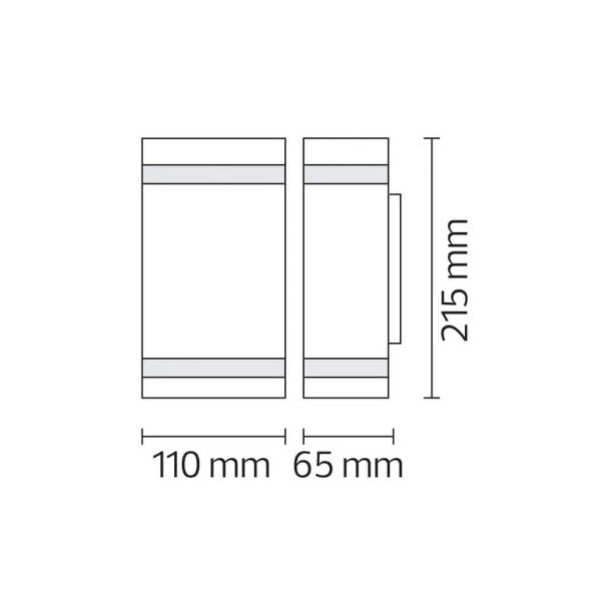 Baštenska zidna lampa 2xGU10 REGNUM-4 crna. Brend: Horoz electric. Materijal:Aluminijum + PC (polikarbonat). Materijal tela: Aluminijum. Materijal difuzora i proreza: PC (polikarbonat). Difuzori i prorezi na lampi su transparentni. Izvor svetla: 2 x Gu10 max 35W. Radni napon: 220-240V. Dimenzije: dužina 110 mm x širina 65 mm x visina lampe 215 mm. Boja osnove lampe: Crna. IP zaštita: IP44 (vodootporna). Način montaže: Na zid (fasadna rasveta). Isijavanje svetlosti: Naviše, naniže i kroz proreze na lampi. Sijalice uključene u cenu: NE.
