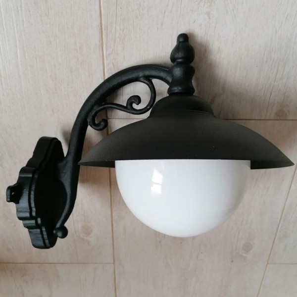 Baštenska zidna lampa 1xE27 VISIBABA-1Z crna. Brend: Svetlost. Materijal : Metal + Aluminijum + masivno staklo. Dimenzije senila (abažura): prečnik 250 mm x visina 160 mm. Dimenzije stakla (polukugla): prečnik 160 mm x visina 140 mm. Visina lampe sa držačem: 300 mm. Od zida: 315 mm. Dimenzije dela, koji se montira na zid: 155 mm x 125 mm. Boja tela lampe: Mat crna. Materijal tela lampe: Metal + Aluminijum (plastificirano). Materijal senila: Masivno staklo. Grlo keramičko: 1 x E27. Snaga: 1 x max 60W. Napon: 220-240V/50-60Hz. IP zaštita: IP44 (vodootporna). Lampa je masivna. Sijalica uključena u cenu: NE. Napomena: Po želji kupca, lampa može biti odrađena u nestandardnoj dimenziji. Takođe, ova lampa se izrađuje i u beloj boji i u bakarnoj boji.