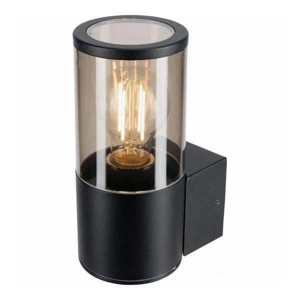 Baštenska zidna lampa 1xE27 M914 S crna+smoky - zidna spoljna svetiljka. Brend: Mitea lighting. Materijal: Aluminijum. Prečnik senila : Ø76 mm. Od zida: 106 mm. Visina lampe: 200 mm. Tip grla: 1 x E27. Izvor svetla: 1 x max. A60. Boja tela: Crna. Boja senila: Smoky (dim boja). Radni napon: 220~240V. IP zaštita: IP54 (vodootporna). Stepen električne zaštite: I klasa Način montaže: Na zid (fasadna rasveta). Sijalice uključene uz proizvod: NE.