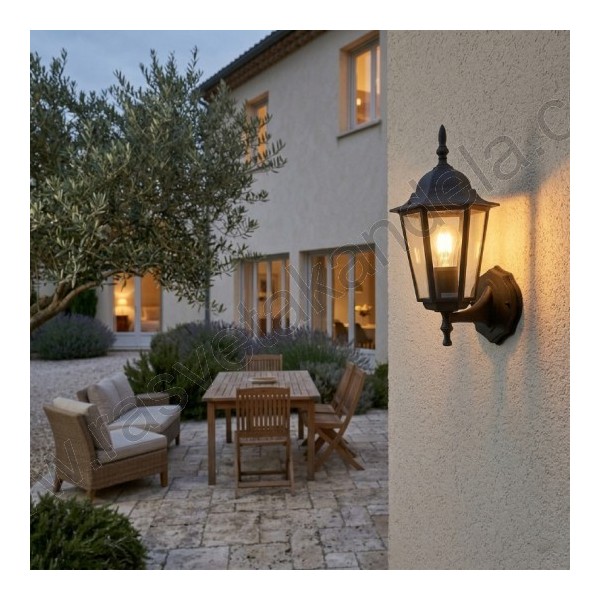 Fenjer zidni M2002-G crni. Brend: Mitea lighting. Materijal: Legura aluminijuma (nerđajući) + staklo. Boja tela: Crna. Staklo je prozirno. Broj staklenih delova: 6. Visina: 365 mm. Od zida: 200 mm. Grlo porcelansko: 1 x E27. Snaga: 1 x max. 60W. Radni napon: 220-240V. IP zaštita: IP44 (vodootporan). Grlo je smešteno u donjem delu fenjera. Način montaže: Na zid (fasadna rasveta). Stepen električne zaštite: I klasa. Sijalica uključena uz proizvod: NE. Težina: 950g.