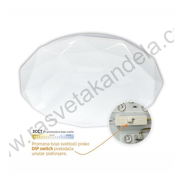 LED plafonjera 24W 3000/4000/6500K M205402-CCT DIAMOND. Brend: Mitea lighting. Materijal: Aluminijum + plastika. Materijal dela, koji se montira na plafon: Aluminijum. Materijal senila: Plastika. Dimenzija: 420 mm x 100mm. LED: SMD. Snaga: 24W. Potrošnja električne energije: 24kWh/1000h. Lumen flux: 2150 Lm. Temperatura boje svetlosti: 3000K (toplo bela)/4000K (prirodno bela)/6500K (hladno bela). Promena boje svetlosti vrši se putem prekidača unutar plafonjere. Ugao rasipanja svetlosti: 120º. Životni vek: 25.000 h na 25° C. Temperatura okoline: 0~ +40 °C. Pravilna montaža: Na plafon. Potrošnja električne energije: 24kWh/1000h. CRI - indeks reprodukcije boja: ≥80(Ra). Broj ON/OFF: 10000x. Stepen električne zaštite: I klasa. Radni napon: 180-260V. Dimabilnost: NE. Energetska efikasnost: F. IP zaštita: IP20. Težina: 1,1kg.