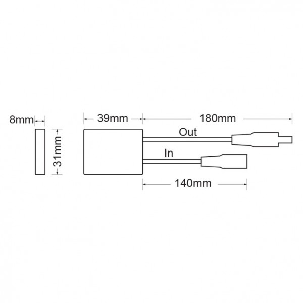 Prekidač za LED traku sa senzorom pokreta ruke. Tip: Senzor prekidač. Tip kontrole: Uključivanje i isključivanje. Funkcije: ON/OFF. Upravljanje: Senzor, domet senzora: 3-15 cm. Međusobna sinhronizacija: Ne. Ulazni napon: 12-24V DC. Izlazni napon: 12-24V DC. Maksimalna struja na izlazu: 3 A. Maksimalna snaga na izlazu: 36 W (12V), 72 W (24V). Materijal kućišta: Metal. Radna temperatura: -20°C do +60°C. IP zaštita: IP20. Masa: 28 g. Dimenzije: 39x31x8 mm, dužina kabela: ulaz: 140 mm, izlaz: 180 mm.