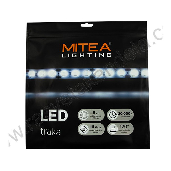 LED traka MLS-2835-120-48V 3000K 48V 7,2W 120d IP67 - 40m kotur. Brend: MITEA Lighting. LED: SMD dimenzije led trake: Dužina 40 m x širina 10 mm. Radni napon: 48V. Snaga (procenjena): 7,2W /1m. Potrošnja elek. energije: 7 Kwh / 1000h. Energetska efikasnost 2019/2015: E. Lumen flux (nom.): 800 (lm). Temp. boje svetl.: 3000 K (toplo bela). Ugao rasipanja svetlosti (nom.): 120º. CRI - indeks reprodukcije boja: ≥80(Ra). IP zaštita: IP67 (vodootporna). Stepen električne zaštite: III klasa. Životni vek: 20.000 h na 25° C. Temperatura okoline: -5~ +40 °C. Dimabilnost: Da. Samolepljiva: Da. Broj dioda po metru: 120. Dužina segmenta: 100 mm. Dužina trake: 40 m. Širina trake: 10 mm.