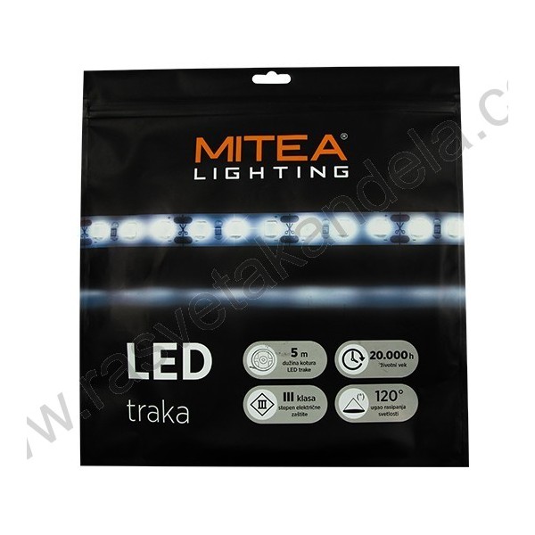 LED traka MLO-2835-120-ML 6500K 5m 12V 10W 120d IP65. Brend: MITEA Lighting. LED: SMD 2835. Radni napon: 12V. Snaga (procenjena): 10W /1m. Potrošnja elek. energije: 10/1m Kwh /1000h . Lumen flux (nom.): 1400 (lm)/m. Energetska efikasnost 2019/2015: D. Temp. boje svetl.: 6500K ( hladno bela ). Ugao rasipanja svetlosti (nom.): 120º. IP zaštita: IP65 (vodootporna). Stepen električne zaštite: III klasa. Životni vek: 20.000 h na 25° C. Temperatura okoline: -5~ +40 °C. Dimabilnost: Da. Samolepljiva: Da. Broj dioda po metru: 120. Dužina segmenta: 25 mm. Dužina trake: 5 m. Širina trake: 8 mm.