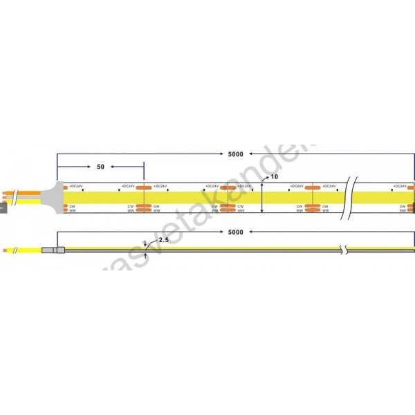 COB LED traka CCT 5m 24V 7+7W/m 624d IP20 ST4961. Brend: Optonica. Dimenzije: L5000 x 10 x 2,5 mm. Artikal: LED traka. Materijal: Flex PCB. LED: COB Radni napon: 24V DC. Snaga (procenjena): Max. 14W. Potrošnja elek. energije: Max. 14 Kwh / 1000h. Energetska efikasnost F. Lumen flux (nom.): 700 (lm/m). Temp. boje svetl. 3CCT: 2700K (toplo bela)/4000K (prirodno bela)/6000K (hladno bela). Ugao rasipanja svetlosti (nom.): 180º. IP zaštita: IP 20. Stepen električne zaštite: III klasa. Životni vek: 25.000 h. Temperatura okoline: -20~ +40 °C. Dimabilnost: Da. Samolepljiva: Da. Broj dioda po metru: 624. Dužina segmenta: 50mm. Dužina trake: 5m. Širina trake: 10mm. Visina trake: 2,5mm. Težina: 150g. Cena je izražena za 5 m.