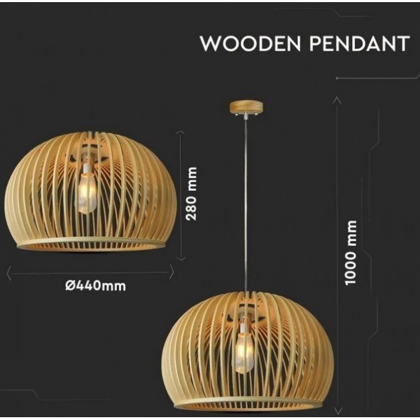Visilica 1xE27 VT40541 drvena. Brend: V-tac. Način izrade: Hand made. Materijal: Metal + drvo. Materijal dela, koji se montira na plafon: Metal. Materijal abažura: Drvo. Boja tela: Boja drveta - braon. Visina visilice: Max. 1000 mm. Visina visilice se može podešavati. Dimenzije abažura: prečnik 440 mm x visina 280 mm. Grlo: 1 x E27. Snaga: 1 x max. 40W. Radni napon: 220-240V. Način montaže: Na plafon. IP zaštita: IP20. Sijalice nisu uključene u cenu proizvoda. Namena: za dnevne sobe, za trpezarije iznad trpezarijskog stola, za spavaće sobe. Takođe, veoma je atraktivna i za urbane prostorije, kao što su kancelarije kafići, restorani, hoteli, butici...