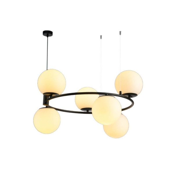 Luster visilica 6xE27 PEGAZ-6R BK crna. Brend: Megga. Dimenzije: Prečnik 500 mm x H: 500 mm. Prečnik kugle: 150 mm. Prečnik otvora na kugli: 48 mm. Predviđena je za sijalice: E27 G45. Materijal: Metal + staklo. Tip grla: 6 x E27. Izvor svetla: 6 x max.40W. Boja tela: Crna. Boja stakla: Bela. Kugle su zatvorenog tipa i šrafe se uz pomoć navoja. Radni napon: 220~240V. Sijalice uključene uz proizvod: NE. IP zaštita: IP20. Stepen električne zaštite: I klasa. Visina lustera se može podešavati. Način montaže: Na plafon. Težina: 3 kg.