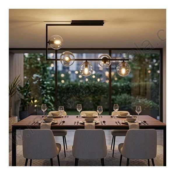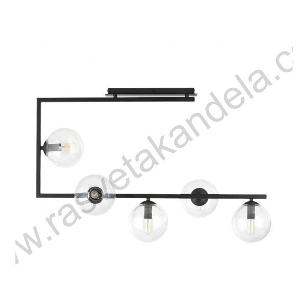 Luster 5xE27 M10770-5 crni. Brend: Mitea lighting. Materijal: Metal + staklo. Prečnik dela, koji se montira na plafon: 250 mm. Prečnik kugle: 130 mm. Dimenzije: Dužina 730 x šrina 270 mm x visina 480 mm. Materijal tela: Metal. Boja tela lustera: Crna. Materijal kugli: Staklo. Boja stakla: Transparentna. Grlo: 5 x E27. Snaga: 5 x max. 60W. Radni napon: 220-240V. IP zaštita: IP20. Klasa električne zaštite: I. Način montaže: Na plafon. Sijalice uključene: NE. Težina: 2,8 kg.