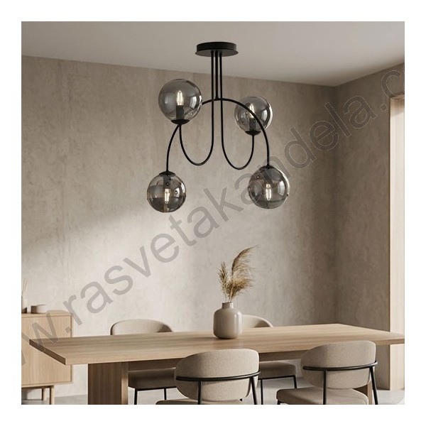 Luster 4xE27 M11099-4 crni. Brend: Mitea lighting. Materijal: Metal + staklo. Prečnik dela, koji se montira na plafon: 115 mm. Prečnik kugle: 130 mm. Dimenzije: Dužina 530 x šrina 530 mm x visina 530 mm. Materijal tela: Metal. Boja tela lustera: Crna. Materijal kugli: Staklo. Boja stakla: Dim boja, transparentna. Grlo: 4 x E27. Snaga: 4 x max. 60W. Radni napon: 220-240V. IP zaštita: IP20. Klasa električne zaštite: I. Način montaže: Na plafon. Sijalice uključene: NE. Težina: 2kg.