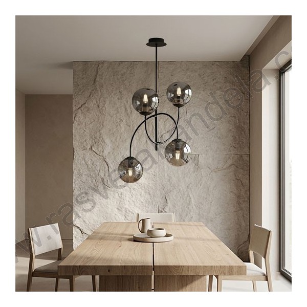Luster 4xE27 M11100-4 crni. Brend: Mitea lighting. Materijal: Metal + staklo. Prečnik dela, koji se montira na plafon: 115 mm. Prečnik kugle: 130 mm. Dimenzije: Dužina 530 x šrina 530 mm x visina 610 mm. Materijal tela: Metal. Boja tela lustera: Crna. Materijal kugli: Staklo. Boja stakla: Dim boja, transparentna. Grlo: 4 x E27. Snaga: 4 x max. 60W. Radni napon: 220-240V. IP zaštita: IP20. Klasa električne zaštite: I. Način montaže: Na plafon. Sijalice uključene: NE. Težina: 2kg.