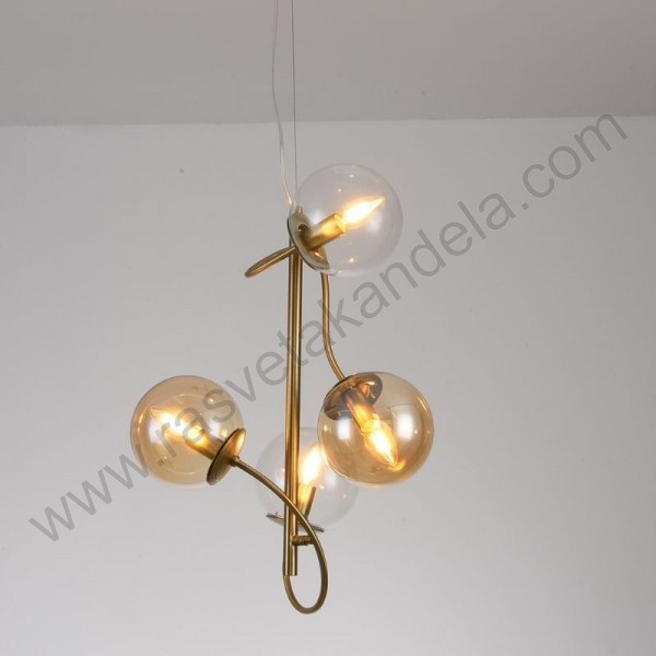 Visilica 4xE14 GLOBE brušeno zlatne boje. Brend: Megga. Materijal: Metal + staklo. Grlo: 4 x E14. Snaga: 4 x max.40W. Radni napon: 220-240V/50-60Hz. Boja tela: Brušeno zlatna (brushed gold). 2 boje stakla: Amber i transparentna. Pakovano bez sijalice. IP zaštita: IP 20. Način montaže: Na plafon.