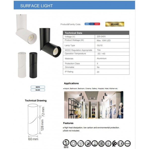 Nadgradna lampa usmeriva 1xGU10 MIAMI bela. Brend: Horoz Electric. Materijal: Aluminijum. Prečnik lampe: 60 mm. Visina: 200 mm. Boja tela: Bela. Radni napon: 220V-240V ili 12V. Grlo: 1 x GU10. Snaga: 1 x max.10W za LED. Radna temperatura: -30 - +40C. IP zaštita: IP20 (za unutrašnju upotrebu). Način montaže: Na plafon. Klasa zaštite: II. Sijalica uključena u cenu: NE. Težina: 300g.