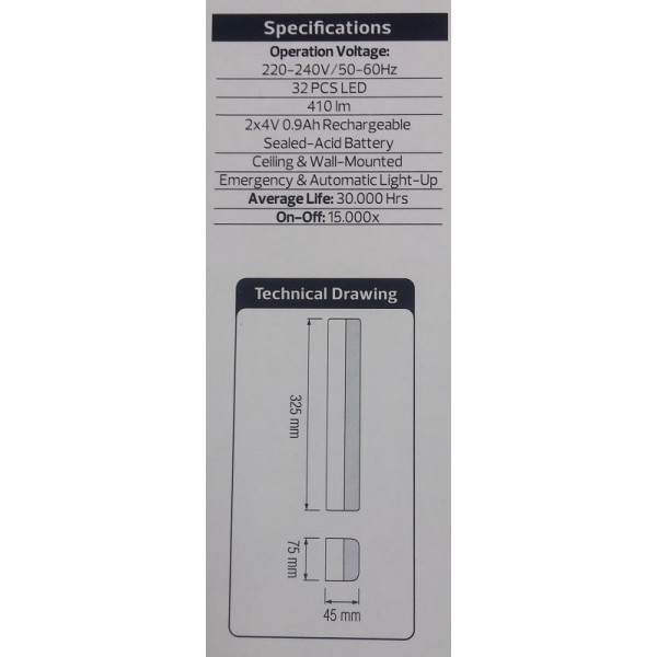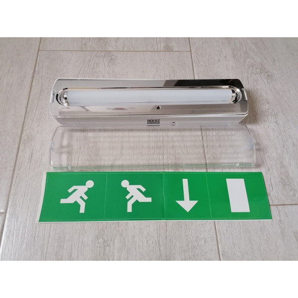 Panik lampa LED HL 308L. Brend: Horoz electric. Dimenzije: 325 x 75 x 45 mm. Napon: 220-240V / 50-60Hz. Snaga: 16W. Potrošnja električne energije: 16kWh/1000h. Boja svetlosti: 7000K-9000K. Osvetljaj: 410 Lm. Tip led dioda: SMD LED. Broj led dioda: 32. Hermetički zatvorena unutrašnja punjiva baterija 2x4V, 0,9 Ah (Sealed Acid). Vreme rada: 3 h. Stepen zaštite: IP20. Životni vek: 30000 h. ON/OFF: 15000x. Kablom se ulazi u telo lampe, nema priključaka sa strane. Lampa je pakovana sa 4 posebne nalepnice. Kombinacijom dobijate željeni smer evakuacije. Energetska efikasnost: A.