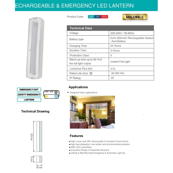 Panik LED lampa M631L. Brend: Mitea lighting. LED: SMD Boja: Bela Dimenzije: L: 241 x W: 60 x H: 45 mm Radni napon: 210~250V Snaga (procenjena): 2W Potrošnja elek. energije: 2 Kwh / 1000h Lumen flux (nom.): 180 (lm) Temp. boje svetl.: 6500 K (Dnevna svetl.) Ugao rasipanja svetlosti (nom.): 120º CRI - indeks reprodukcije boja: ≥70(Ra) IP zaštita: IP40 Materijal: ABS (Akrilonitril butadien stiren) Stepen električne zaštite: II klasa Životni vek: 20.000 h na 25° C Temperatura okoline: 0~ +40 °C Način montaže: Na plafon ili na zid Kapacitet baterije: 3,7V 1500 mAh Vreme rada baterije: 3~6h Prekidač: ON-OFF Dimabilnost: Ne EXIT nalepnica u kompletu sa proizv.: Da Daljina uočavanja: 16m Vreme punjenja: 20-24h Režim rada: Pripravni režim Težina: 600g. Energetska efikasnost: A.