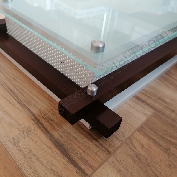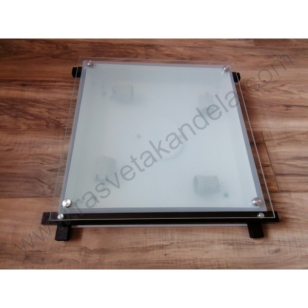 Drvena plafonjera 46cmx46cm 4xE27 234-4 tamno drvo. Brend: Svetlost. Rustična serija. Materijal: Metal + staklo + drvo. Dimenzije drvenog rama: 460 mm x 460 mm. Dimenzije drvene gredice: 460 mm x 20 mm x 15 mm. Debljina drvene gredice: 15 mm. Visina plafonjere: 85 mm. Boja drvenog rama: Tamno braon. Osnova plafonjere je metalna sa rupičastim dezenom. Boja stakla: Mat bela. Grlo porcelansko: 4 x E27. Snaga: 4 x max. 60W. Oblik plafonjere: Kvadrat. Boja elemenata, koji su pričvršćeni drveni ramovi i staklo: Mat hrom. Materijal unutrašnjosti plafonjere: Metal u beloj boji. Radni napon: 220-240 V. IP zaštita: IP20. Način montaže: Na plafon. Veoma masivna plafonjera. Osnovne karakteristike lampe su visok kvalitet u izradi i masivnost. Težina: 3,5 kg.