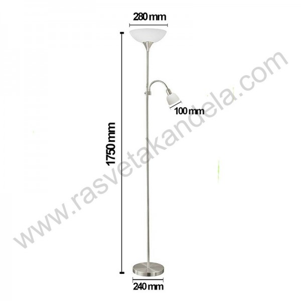 Podna lampa VARESE bela sa telom u mat hrom boji. Brend: Megga. Materijal: Metal + Akril. Materijal tela lampe: Metal. Materijal abažura: Akril (plastična masa). Izvor svetla: 1xE27 max. 60W, 1 x E14 max. 40W. Visina: 1750 mm. Prečnik većeg abažura: 280 mm. Prečnik manjeg abažura: 100 mm. Prečnik postolja: 240 mm. Boja osnove lampe, tj. tela lampe: Mat hrom. Boja abažura: Bela. Radni napon: 220~240V. Ručica lampe sa manjim abažurom (čitač lampe) se može usmeravati. Može se i pomerati gore-dole na telu lampe. IP zaštita: IP20. Način montaže: Na pod. Postolje: Masivno i stabilno. Prekidač: Međugajtanski. Težina lampe: 3,2 kg.