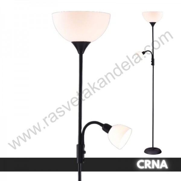 Podna lampa THALES crna. Brend: Megga. Materijal: Metal + PVC. Materijal tela lampe: Metal. Materijal abažura: PVC (plastična masa). Izvor svetla: 1xE27 max. 60W, 1 x E14 max. 40W. Visina: 1790 mm. Prečnik postolja: 250 mm. Boja osnove lampe, tj. tela lampe: Crna. Boja abažura: Bela. Radni napon: 220~240V. Ručica lampe sa manjim abažurom (čitač lampe) se može usmeravati. Može se i pomerati gore-dole na telu lampe. IP zaštita: IP20. Način montaže: Na pod. Postolje: Masivno i stabilno. Prekidač: Međugajtanski.