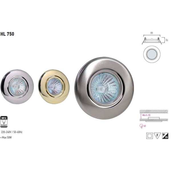 Ugradna lampa HL 750 ORKIDE hrom - usmeriva rozetna. Brend: Horoz electric. Materijal: Metal. Boja tela: hrom. Prečnik rozetne: 85 mm. Dubina rozetne: 27 mm. Dimenzija za bušenje: 60 mm. Tip sijalice: MR16 GU5.3 max.50W. Stepen zaštite: IP20. Sijalica nije u kompletu. Sijalično grlo GU5,3 u kompletu. Težina: 100 g.