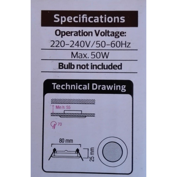 Rozetna - ugradna lampa HL752, usmeriva svetiljka. Brend: Horoz electric. Materijal: Metal. Boja tela: hrom. Rozetna je usmeriva. Prečnik rozetne: 80 mm. Dubina rozetne: 25 mm. Dimenzija za bušenje: 70 mm. Tip sijalice: MR16 GU5.3 max.50W. Stepen zaštite: IP20. Sijalica nije u kompletu. Sijalično grlo GU5,3 u kompletu.