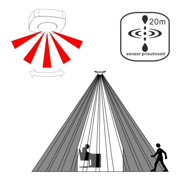 Senzor prisutnosti M274-1. Brend: MITEA Lighting. Boja: Bela. Radni napon: 220~240V. IP zaštita: IP20. Maksimalno opterećenje za ink. sijalice: 2000W. Maks. opterećenje za LED sijalice: 1-1000W. Stepen električne zaštite: II klasa. Temperatura okoline: -20~ +40 °C. Potrošnja u "stand by" režimu: 0,5 Wh. Osetljivost (razdaljina): max. 20m. Osetljivost (ugao): 360°. Podesiva svetlosna osetljivost (lux): 3~2000 lux. Podesivo vreme rada: 10 sec.~30 min. Brzina detekcije pokreta: 0.6-1.5m/s. Preporučena visina za instalaciju: 2.2m-6m. Dimenzije: W102,5x L102,5 x H58,3mm. Vlažnost okoline:< 93%RH. Detektuje i najmanje pokrete tela. Dobro se mogu primeniti za komandu rasvete u prostorijama, gde se ljudi nalaze duže vreme u relativno statičnom položaju, (WC, kancelarija...).