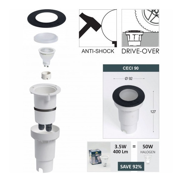 Izvor svetlosti je grlo GU10, što je čini izuzetno praktičnom spoljnom ugradnom lampom. Što znači da je izvor svetlosti zamenljiv i korisnik prema svojim željama i potrebama može koristiti LED sijalice različite snage i boje svetlosti.