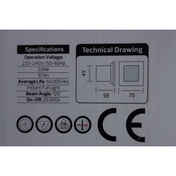 Spoljna ugradna LED lampa GUMUS HL951L. Brend: Horoz electric. Materijal: Aluminijum+nerđajući čelik+staklo. Boja svetlosti: Hladno bela. Izvor svetla: 9x0,1W LED. Potrošnja električne energije: 0,9kWh/1000h. Osvetljaj: 57 Lm. Napon: 220-240V. Dimenzije: 70x70x58mm. Ugradna dimenzija: 45x45mm. Radni vek: 50.000h. Boja osnove lampe: Mat hrom. Energetska efikasnost: A do A++. Način montaže: U zid (fasadna rasveta). IP zaštita: IP54 (vodootporno).