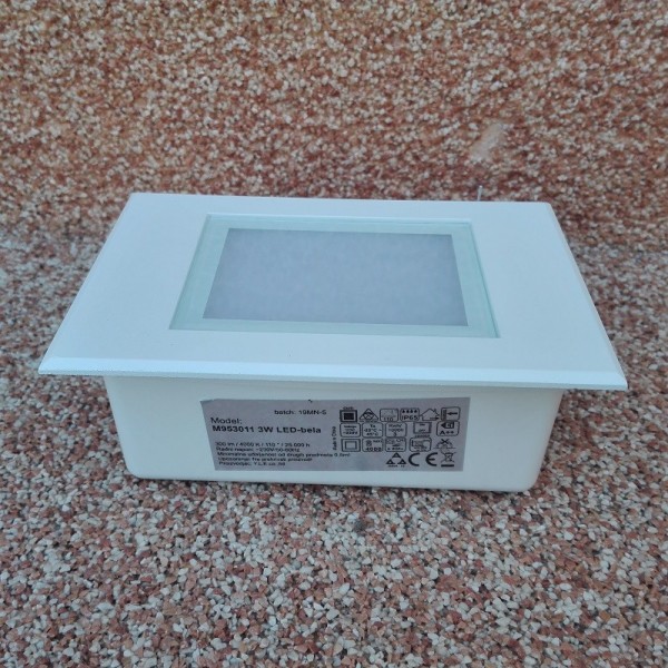 Spoljna ugradna LED lampa M953011 3W 4000K bela. Brend: Mitea lighting. Materijal: Aluminium + PC + Staklo. Dimenzije lampe: 120 x 80 x 50mm. Dimenzije za otvor: 110 x 70mm. Artikal: Ugradna lampa. LED: SMD 2835. Boja: Bela. Radni napon: 200-240V. Snaga (procenjena): 3W. Potrošnja električne energije: 3kWh/1000h. Energetska efikasnost: F. Lumen flux (nom.): 110 (lm). Temp. boje svetlosti: 4000 K. IP zaštita: IP65 (vodootporna). Stepen električne zaštite: II klasa. Način montaže: Ugradna, u zid. Poseduje integrisan izvor svetlosti. Težina: 200 g.