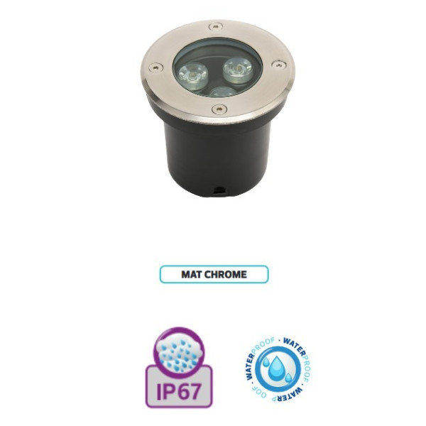 Spoljna LED lampa za ugradnju u beton 3W 4000K AZUR-3 IP67 - vodootporna. Brend: Horoz electric. Materijal: Nerđajući čelik + staklo. Snaga: 3W. Ekvivaletna snaga: 24W. Boja svetlosti: 4000K (prirodno bela). Potrošnja električne energije: 3kWh/1000h. Energetska efikasnost: F. Jačina osvetljaja: 300 Lm. Napon: 85-265V/50-60Hz. Prečnik: 80 mm. Dubina: 95 mm. Prečnik otvora za ugradnju:70 mm. Boja osnove lampe: Mat hrom. Tip LED dioda: Power led. Broj led dioda: 3. Radni vek: 50.000h. Broj ON/OFF: 25000x. Vreme startovanja: <0.2s. Ugao rasipanja svetlosti: 120 stepeni. Power factor: >0,3. Colour Render Index (Ra): >Ra70. Dimabilnost: NE. Klasa električne zaštite: I. Način montaže: U beton (pod). IP zaštita: IP67 za ugradnju u beton (pod) - vodootporna.