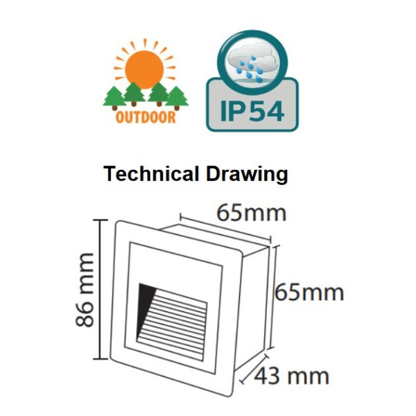Spoljna ugradna LED lampa 60x60x47mm M953042 3W 4000K. Brend: Mitea lighting. Materijal: Aluminium + PC. Dimenzije lampe: 85 x 85 x 53mm. Dimenzije za otvor: 74 x 74mm. Boja: Bela. Radni napon: 220~240V. Snaga (procenjena): 3W. Potrošnja elek. energije: 3 Kwh/ 1000h. Energetska efikasnost: F. Lumen flux (nom.): 30 (lm). Lumen without cover: 300 (lm). Temp. boje svetl.: 4000 K . Ugao rasipanja svetlosti (nom.): 30º. CRI - indeks reprodukcije boja: ≥80(Ra). IP zaštita: IP65. Stepen električne zaštite: I klasa. Životni vek: 25.000 h na 25° C. Temperatura okoline: -25~ +45 °C. Način montaže: U zid. Dimabilnost: Ne. ON-OFF ciklus prekida: 25.000 X. Integrisani LED: DA. Težina: 250 g.