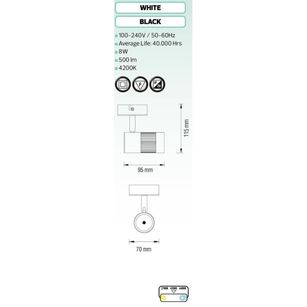Zglobna nadgradna spot LED lampa TOKYO sa integrisanim LED čipom. Brend: Horoz electric. Napon: 100-240V , 50-60Hz. Led: COB LED. Snaga: 8W. Potrošnja elektrisčne energije: 8kWh/1000h. Ekvivalentna snaga: 64W. Osvetljaj: 500 Lm. Boja svetlosti: 4200K. Boja tela: bela. Materijal: Aluminijum. Dimenzije: 95 x 115 mm. Prečnik dela za tiplovanje: fi 70 mm. Ugao rasipanja svetlosti: 53 stepena. Radni vek: 40000h. ON/OFF: 20.000x. IP zaštita: IP20. Težina spot lampe: 300 g. Energetska efikasnost: A do A++. Namena je višestruka: za hodnike, dnevne, spavaće sobe, kuhinje, kao dekorativna zidna lampa ili spot lampa za montažu na plafon. Takođe, atraktivna je i za urbane prostorije, kao što su kafići, frizerski saloni, butici...