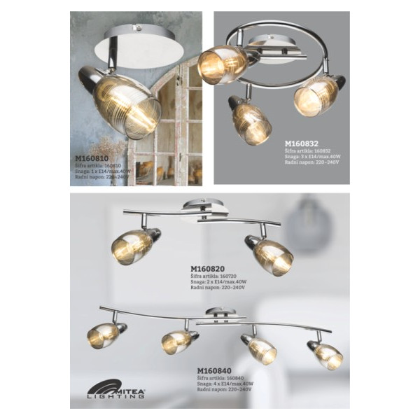 Spot lampa M160840. Brend: Mitea lighting. Dužina lampe: 810 mm. Prečnik dela, koji se montira na zid/plafon: 90 mm. Boja: Hrom. Radni napon: 220~240V. Tip grla: E14. Broj grla: 4. Snaga: 4 x max. 40W. Dimenzije stakla: prečnik 65 mm x visina 90 mm. Boja stakla: Transparentna + hrom (efekat ogledala), dekorisana linijama. IP zaštita: IP20. Stepen električne zaštite: I klasa. Lampa je zglobna, tako da su abažuri pokretni. Način montaže: Na plafon/zid. Težina: 1,9 kg.