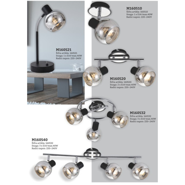 Spot lampa M160520 sa efektom ogledala. Brend: Mitea lighting. Materijal: Metal + staklo. Materijal tela: Metal. Boja tela: Crna + Hrom (efekat ogledala). Materijal kugli: Staklo u hrom boji dekorisano prozirnim linijama sa efektom ogledala. Dužina spot lampe: 250 mm. Dimenzije kugle: prečnik 90 mm x H85 mm. Prečnik otvora na kugli: 70 mm. Težina kugle: 50g. Prečnik osnove: 100mm. Radni napon: 220~240V. Tip grla: 2 x E14. Izvor svetla: 2 x max.40W. Spot lampa poseduje zglob, tako da se abažuri mogu usmeravati. Sijalice uključene uz proizvod: NE. IP zaštita: IP20. Način montaže: Na zid/plafon. Težina: 1,010 kg.