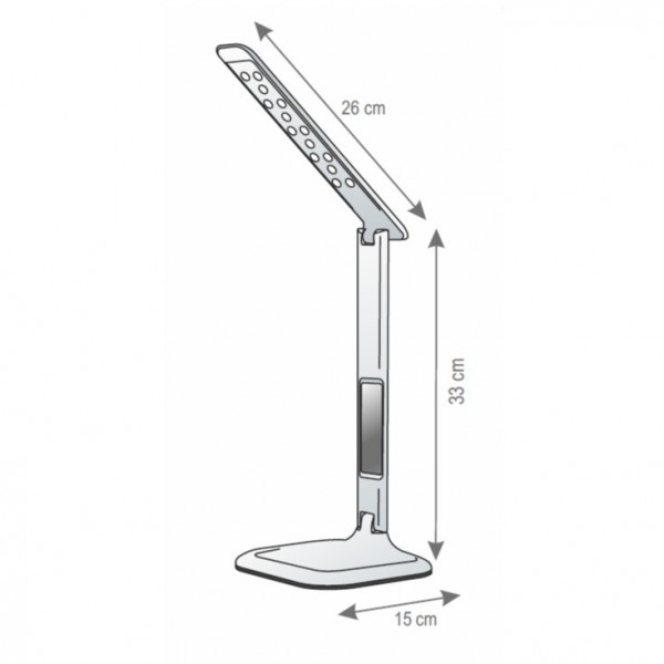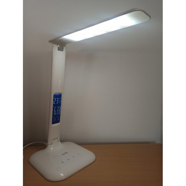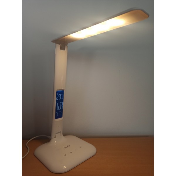 Stona LED lampa sa satom LA51 (video prezentacija u prilogu). Brend: HOME. Štedljiva i bezbedna LED tehnologija. Taster na dodir. Jačina svetlosti podesiva u 5 nivoa. Alarm, kalendar i sat (12/24h), plavi displej. Napajanje: USB strujni adapter (5V/1A), u sklopu; 1 x CR2032 (sat sa kalendarom), u sklopu. Snaga: 5 W. Potrošnja elek. energije: 5 Kwh/1000h. Energetska efikasnost: G. Izvor svetlosti: 4 toplo bele + 10 hladno belih SMD LED dioda. Boja svetlosti: hladno bela, toplo bela. Temperatura svetlosti: 2700/5000 K. Jačina svetlosti: 400 lm. Kućište: plastično. Napojni USB kabel: 1,5 m. Dimenzije: 260x330x150 mm. Težina: 790g.
