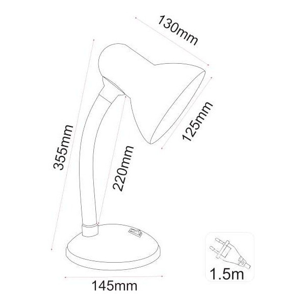 Stona radna lampa M1050 srebrna. Materijal: Metal. Materijal abažura i postolja: Metal. Materijal vrata lampe: PVC (plastična masa). Boja: Srebrna. Boja unutrašnjosti abažura: Bela. Visina lampe: Max. 355 mm. Prečnik abažura: 125 mm. Dužina abažura: 140 mm. Prečnik postolja: 145 mm. Boja vrata lampe: Crna. Vrat lampe je fleksibilan. Prekidač ON/OFF: DA, na postolju lampe. Radni napon: 220-240V/50-60Hz. Grlo: 1 x E27. Snaga: 1 x max. 40W. Temperatura okoline: 0 ~ +40°C. Stepen zaštite: IP 20. Dimabilnost: NE. Sijalice uključene u cenu: NE. Način montaže: Na sto. Lampa poseduje stabilno postolje. Kabl dužine 1,45m. Težina lampe: 1 kg.