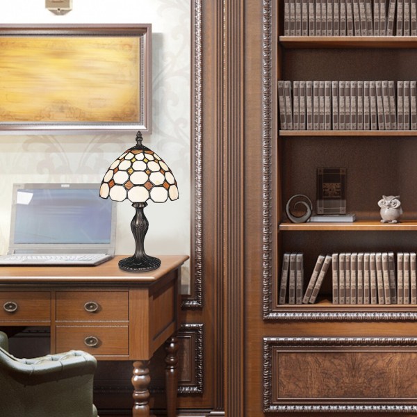 Tifani stona lampa G072289-1. Brend: Lumen. Serija: Tiffany. Materijal : Metal + masivno staklo. Prečnik abažura: 20 cm. Visina lampe: 22,5 cm. Grlo: 1 x E27. Snaga: 1 x max. 60W. Radni napon: 230V. Telo lampe od livenog materijala. Pakovana je bez sijalice. IP zaštita: IP20. Način montaže: Na sto. Osnovna odlika lampe: Visok kvalitet izrade i masivnost.